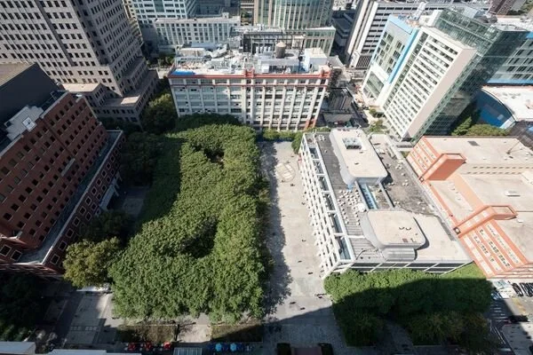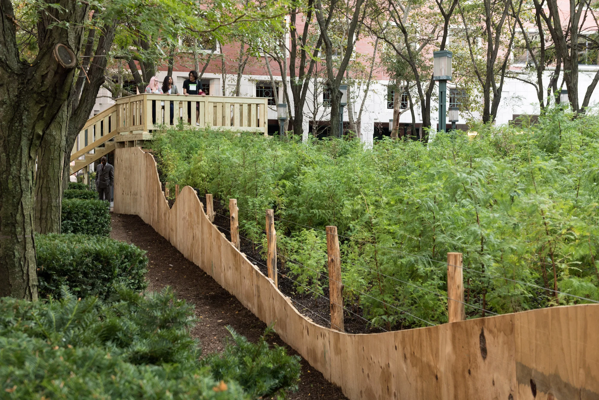 A miniature man-made forest lands in the heart of downtown Brooklyn.